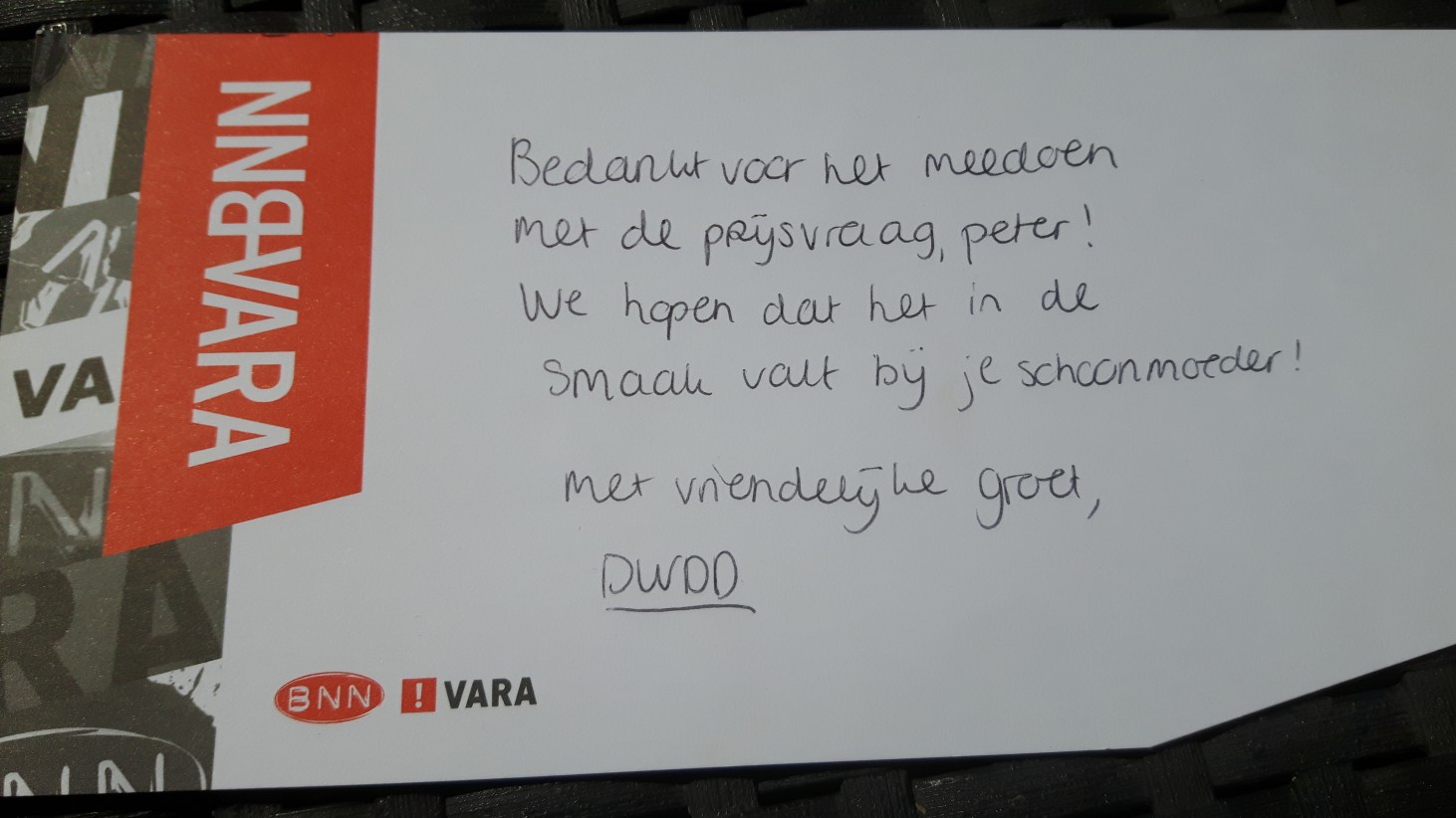 De redactie van DWDD zou tien exemplaren van “Notendop” weggeven aan personen die een goede reden zouden geven waarom zij “recht” dachten te hebben op een exemplaar van het boek. Ik stuurde de redactie een berichtje met daarin de grap dat mijn schoonmoeder van bijna negentig jaren oud altijd een groot fan was geweest van de boeken van McEwan, maar helaas op haar oude dag blind was geworden. Wat zou het leuk zijn om haar het boek voor te kunnen lezen als ik een exemplaar van de laatste roman van Ian McEwan zou “winnen.” Ik werd een winnaar.