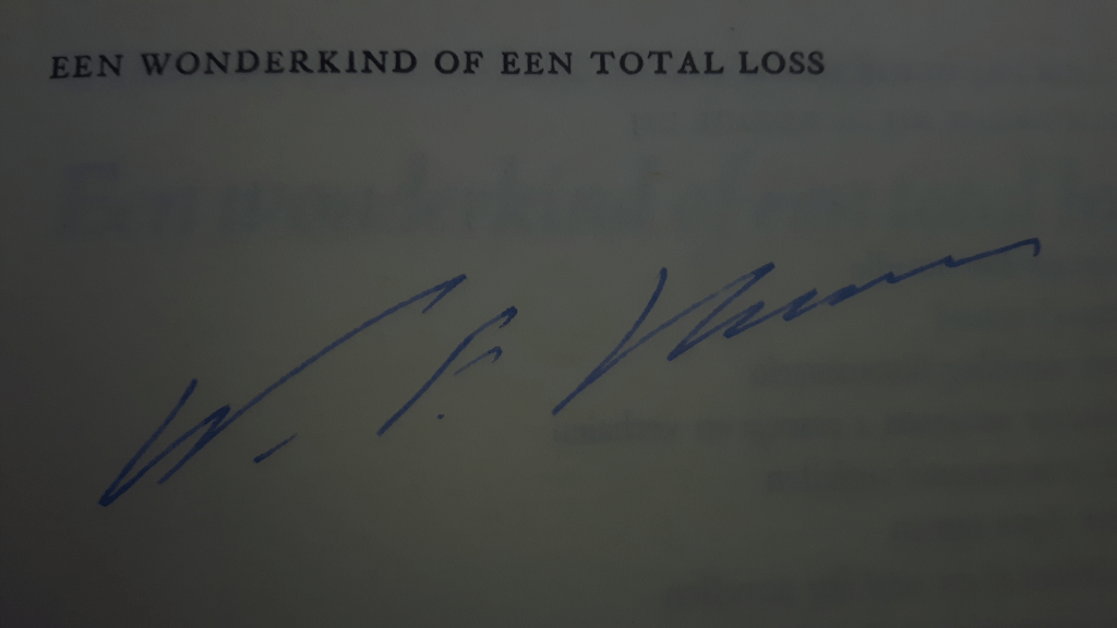 Opgelucht vocht ik mij een weg naar de kassa van de boekenafdeling, want met al die politie in de buurt fluitend met de roltrap naar beneden gaan zonder te betalen zat er die avond niet in. Bij de kassa zag ik pas dat ik de achtste druk uit november 1981 van de in november 1967 verschenen verhalenbundel ‘Een wonderkind of een total loss’ in mijn handen hield.